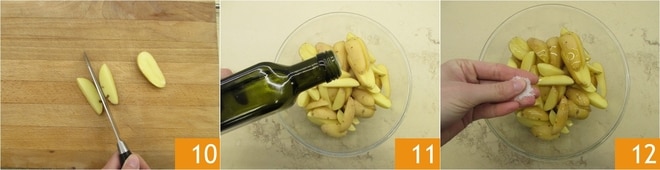Passe agora para as batatas. Lave-as bem e, sem descascá-las, corte cada uma em 4 pedaços. Transfira para uma tigela e tempere com óleo 11 e flocos de sal 12.