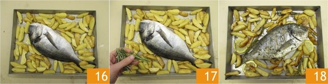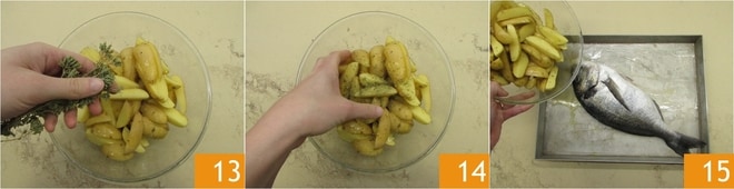 Adicione orégano seco 13 e misture bem 14. Agora transfira a dourada para uma assadeira grande, bem untada, e coloque também as batatas 15.