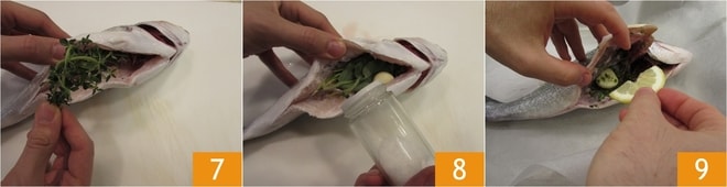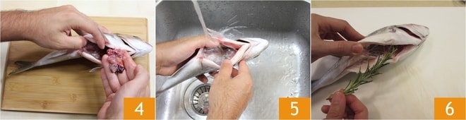 Nesse ponto, remova as vísceras 4 e enxágue bem a dourada sob água corrente para eliminar as impurezas 5. Preencha a cavidade com raminhos de alecrim 6.