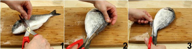 Para começar a preparar o dourado à água louca, inicie com a limpeza do dourado. Escame e retire as barbatanas laterais do dourado 1, as dorsais 2 e as ventrais 3 (você pode deixar a caudal para verificar posteriormente se o peixe está cozido).