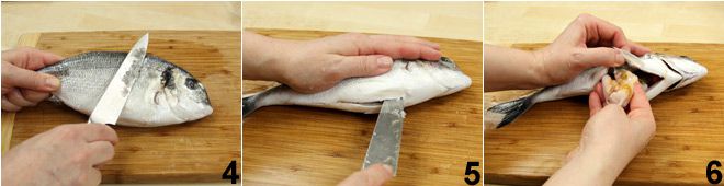 Escame o dourado 4, faça um corte na barriga 5 e eviscere o dourado 6.