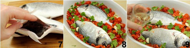 Em seguida, enxágue o dourado em água corrente fria, garantindo que ele esteja bem limpo por dentro também 7. Coloque dentro da barriga uma pitada de sal, um dente de alho e algumas folhas de salsinha. Pegue uma assadeira (ou forma), espalhe azeite de oliva extra virgem no fundo, depois coloque os dourados (ou o dourado se você escolheu um de 800g). Corte os tomatinhos em fatias ou cubos e adicione-os na assadeira junto com os dois dentes de alho restantes cortados em fatias, a salsinha em folhas 8, o sal e a pimenta (ou pimenta fresca se preferir), a água e o vinho branco 9; os líquidos não devem cobrir completamente os dourados, mas ficar abaixo da metade da altura do peixe. Asse em forno pré-aquecido a 220°C por cerca de 20-25 minutos: para garantir que o peixe está cozido, tente puxar a barbatana caudal: se sair facilmente, o dourado estará cozido, caso contrário, se oferecer resistência, cozinhe o peixe por mais alguns minutos.