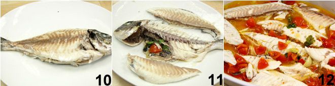 Quando o dourado à água louca estiver cozido, retire a assadeira do forno, coloque o dourado em um prato, retire a pele 10 e divida o dourado em filetes 11, removendo todos os ossos (o grande central e os laterais) e a cabeça. Depois de obter os 4 filetes, coloque-os em um prato de servir, regando-os com o caldo de cozimento 12 e sirva imediatamente. Se preferir o cozimento na panela, proceda da mesma maneira, cozinhando na chama e colocando uma tampa na panela utilizada.