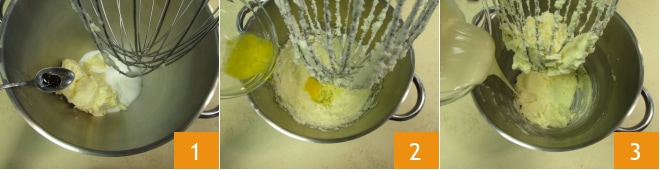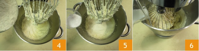 Misture a massa por alguns segundos com o batedor, depois adicione a farinha 4 e o fermento 5. Bata novamente a massa com o batedor e adicione o leite aos poucos, em temperatura ambiente 6.