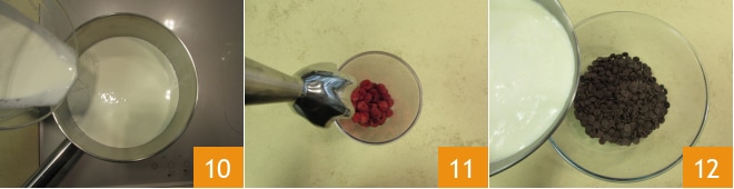 Coloque o creme de leite restante em uma panela 10 e leve para ferver. Coloque as framboesas em um recipiente alto e bata com um mixer de mão 11 até obter um purê. Transfira o chocolate para uma tigela e assim que o creme de leite começar a ferver, despeje metade sobre o chocolate 12.