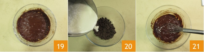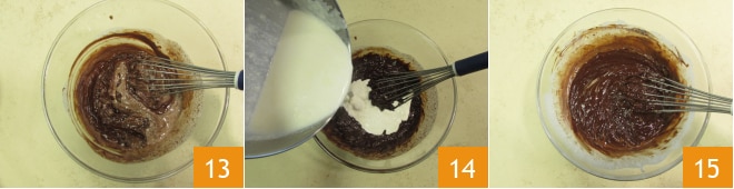 Misture com um batedor 13 e depois despeje o restante do creme de leite quente 14. Misture a mistura até que o chocolate esteja completamente derretido 15.