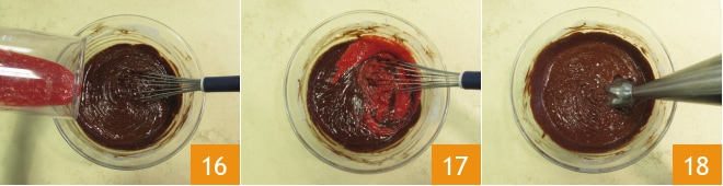 Despeje o purê de framboesas na ganache 16, misture bem com um batedor 17, depois bata levemente com o mixer de mão sem incorporar ar 18.