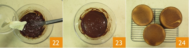 e adicione a manteiga 22. Misture bem até que esteja derretida 23. Cubra com filme plástico e mantenha em temperatura ambiente até o uso. Assim que os três bolos estiverem prontos, desenforme-os em uma grade 24; assim eles esfriarão mais rapidamente. Deixe esfriar por uma hora em temperatura ambiente e uma hora na geladeira.