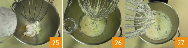 Prepare o creme de manteiga. Coloque a manteiga amolecida e o açúcar de confeiteiro na tigela da batedeira 25. Bata por cerca de 1 min com o batedor, depois adicione também a cachaça 26. Ligue novamente a batedeira e bata o creme com o batedor por cerca de 5 min até obter uma mistura lisa, espumosa e brilhante 27. Reserve em temperatura ambiente até o uso.