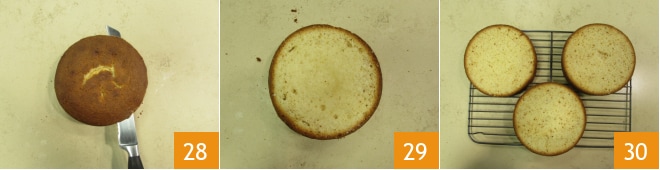 Em seguida, pegue suas bases. Corte com uma faca serrilhada tanto a superfície 28 quanto a base 29. Realize essa operação para todos os 3 bolos 30.