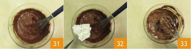 Recupere a ganache de framboesas e misture-a com um batedor 31. Adicione o creme de leite batido aos poucos e misture delicadamente 33 até obter um creme homogêneo.