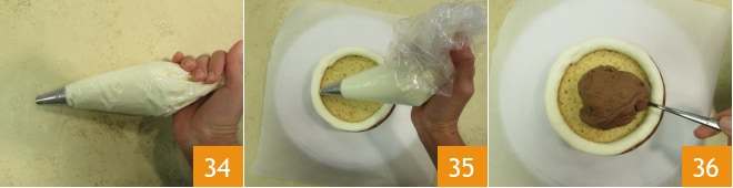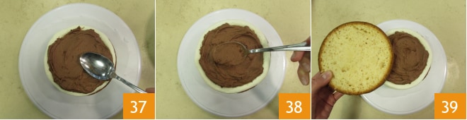 e espalhe com uma colher 37. Coloque a segunda camada de bolo de chocolate branco sobre o creme e recheie como na primeira camada 38. Termine colocando o último disco de bolo de chocolate branco 39.