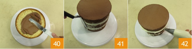 Cubra a superfície com a ganache restante, nivelando bem 40. Em seguida, usando uma espátula, nivele bem também as bordas do bolo 41 e deixe esfriar na geladeira por 15 min. Retire o bolo da geladeira e espalhe um pouco de creme de manteiga nas bordas do bolo 42.
