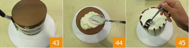 Nivele bem com uma espátula 43, depois cubra também a superfície 44 e nivele novamente com a espátula. O bolo deve ser completamente coberto com o creme de manteiga. Deixe esfriar na geladeira por 1 hora. Neste ponto, aqueça por alguns instantes o creme de cobertura e, usando uma colher, faça o efeito drip derramando um pouco de molho em toda a borda externa 45. Certifique-se de que algumas gotas escorram mais que outras, derramando uma quantidade diferente de ganache.