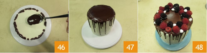 Depois, cubra a superfície com a ganache de cobertura restante 46 e nivele delicadamente com uma espátula 47. Decore a superfície com framboesas e amoras, finalizando com algumas pequenas merengues 48. O drip cake está pronto para servir.