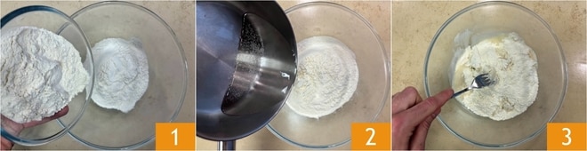Para preparar os dumplings de camarão e vegetais, comece pela massa: misture as farinhas em uma tigela 1, depois despeje a água fervente 2 e misture com um garfo 3.