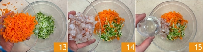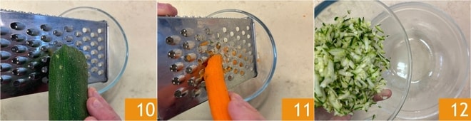 Rale as abobrinhas 10 e as cenouras com um ralador de furos grandes 11. Transfira as abobrinhas para uma tigela grande 12.