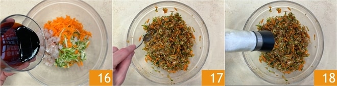 Tempere com o molho de soja 16 e misture bem 17, depois ajuste o sal 18.