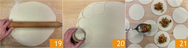 Após o tempo de descanso da massa, estenda-a em uma superfície levemente enfarinhada até formar uma folha fina de 2-3 mm 19. Corte a folha com um cortador de massa de 8 cm de diâmetro 20, depois coloque uma colher de recheio no centro 21.