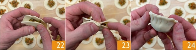 Feche o disco em meia-lua 22 e sele a abertura fazendo pequenas dobras, primeiro de um lado 23 e depois do outro 24.