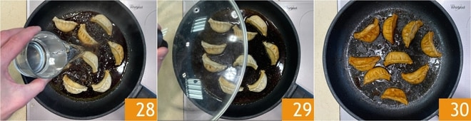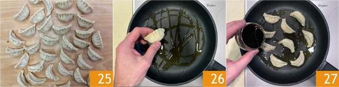 Quando todos os dumplings estiverem prontos 25, proceda ao cozimento: aqueça um fio de óleo em uma frigideira, depois coloque os raviolis 26 e doure-os por alguns minutos em fogo médio. Quando estiverem dourados, adicione o molho de soja 27.