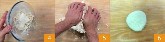 Transfira a mistura para a bancada 4 e trabalhe com as mãos 5 até obter uma massa lisa e homogênea 6. Envolva a massa em filme plástico e deixe descansar à temperatura ambiente por 30 minutos.