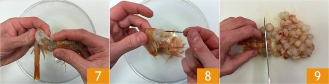 Enquanto isso, cuide do recheio: limpe os camarões removendo a cabeça 7 e as pernas, depois retire o intestino 8 e remova a carapaça. Corte a polpa em pedaços pequenos 9.