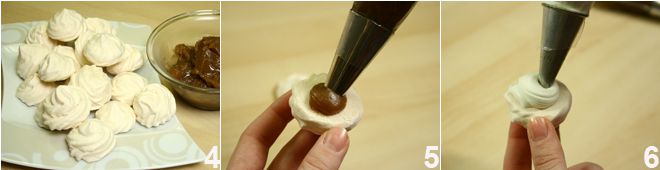 Quando as merengues estiverem prontas e frias 4, coloque o creme de marrons em um saco de confeitar com bico liso e esprema um pouco 5 sobre a parte plana da metade das merengues preparadas. Bata o chantilly e, do mesmo modo que o creme de marrons, enfeite a parte plana da outra metade das merengues 6. Una as duas metades e coloque-as na geladeira para esfriar, depois sirva.