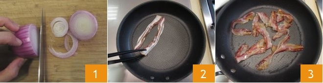 Para preparar o egg burger, primeiro descasque e fatie a cebola 1. Em uma frigideira quente, coloque as fatias de bacon 2 e cozinhe em fogo médio-baixo por 4-5 minutos. Quando estiverem bem crocantes e douradas 3
