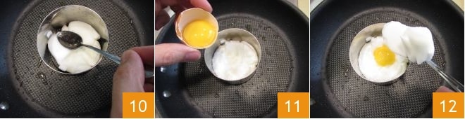 e assim que começarem a ficar mais firmes, adicione o sal 7. Continue até que as claras fiquem espumosas 8. Na mesma frigideira em que você cozinhou o bacon, coloque um aro de metal com diâmetro de 9 cm 9.