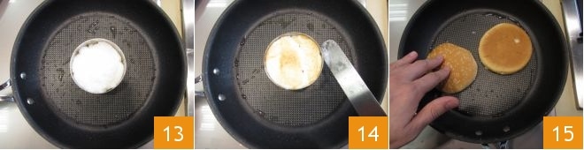 Cozinhe em fogo médio-alto 13 por 2 minutos de um lado e 2 do outro, use uma espátula para virar o ovo e tome cuidado com o aro que ficará muito quente 14. Quando estiver pronto, mantenha o ovo aquecido. Divida ao meio o pão de burger e aqueça-o na frigideira do lado cortado 15,