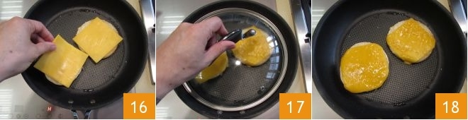 depois vire, coloque as fatias de cheddar 16, cubra com a tampa 17 e aqueça até que o queijo derreta 18.