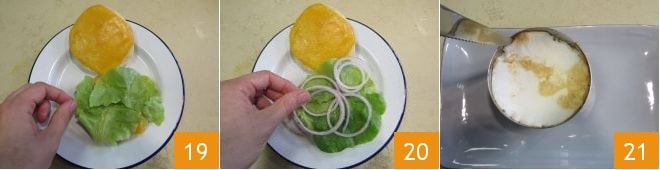 Agora retire do fogo e recheie a base do pão com as folhas mais crocantes da alface 19, previamente lavadas e secas, e alguns anéis de cebola 20. Agora retire o ovo do molde, passando uma faca afiada na borda para facilitar a operação 21.