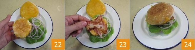 Coloque também o ovo no pão 22 e o bacon 23. Feche com a outra metade do pão e sirva imediatamente seu egg burger 24!