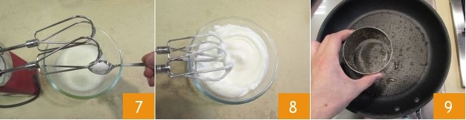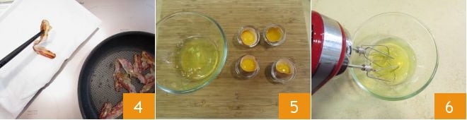 retire-as da frigideira e deixe-as secar em papel toalha 4. Separe as claras das gemas (para a receita você precisará de 4 gemas e 5 claras; a gema restante pode ser utilizada conforme indicado no final da receita) tendo cuidado de manter cada gema separada em uma tigelinha 5. Bata as 5 claras com uma batedeira elétrica 6
