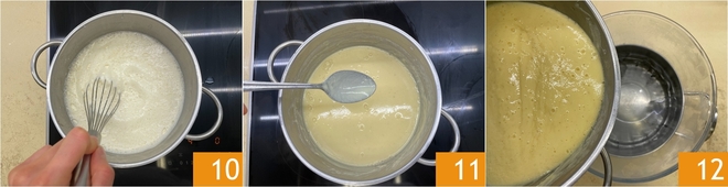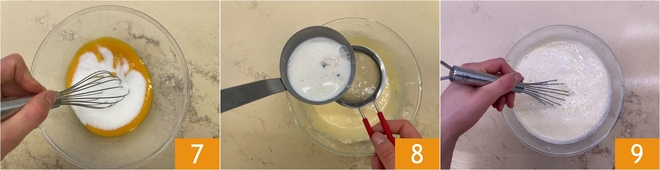 Misture o açúcar e as gemas com um batedor 7 até ficarem claras e espumosas (você também pode usar uma batedeira para facilitar). Quando o leite estiver quente, adicione-o aos poucos à mistura de gemas, coando para remover os cravos-da-índia 8. Esta operação deve ser feita com calma, misturando bem sempre que adicionar o leite 9, assim os ovos não irão cozinhar.
