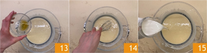 Em seguida, adicione o brandy 13 e misture novamente 14. Por último, adicione também o creme de leite 15.