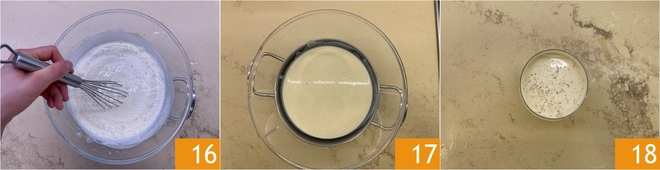 Misture novamente suavemente com o batedor 16 sem incorporar muito ar 17. O eggnog pode ser servido frio, quente ou morno; você pode adicionar uma pitada de noz-moscada em cada copo antes de servir 18.