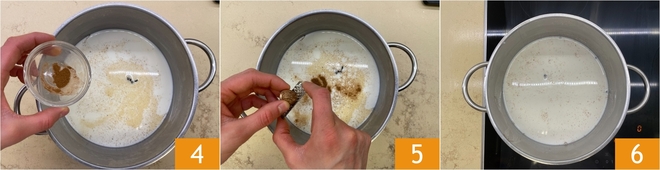 Adicione também a canela em pó 4 e a noz-moscada ralada 5. Leve ao fogo e aqueça em fogo baixo 6; não deve ferver, mas apenas aquecer sem chegar a ferver.