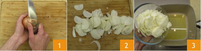 Para preparar o joelho na cerveja, comece limpando as cebolas 1, fatie-as não muito finas 2 e coloque-as em uma panela larga e de bordas altas com um fundo de óleo 3.