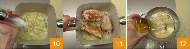 Ajuste o sal das cebolas 10 e, neste ponto, transfira os joelhos selados 11. Na frigideira onde você selou a carne, remova o excesso de gordura e deglace o fundo com a cerveja 12.