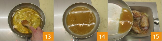 Raspe bem o fundo com uma colher de madeira 13 e deixe ferver tudo por cerca de 5 minutos para engrossar um pouco 14. Transfira o líquido para a panela com os joelhos 15.