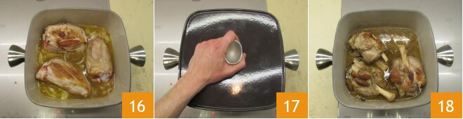 Despeje também o Caldo de carne quente 16 e cubra com a tampa 17 deixando cozinhar em fogo baixo por cerca de 3 horas e meia 18: o tempo pode variar dependendo do tamanho dos joelhos.