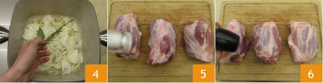 Doure em fogo médio baixo, perfumando com alecrim e louro 4. Enquanto isso, salgue 5 e apimente os joelhos de porco 6.