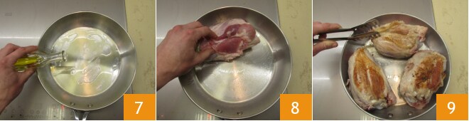 Despeje um pouco de óleo em uma frigideira de aço 7 e sele os joelhos em fogo médio alto, primeiro de um lado 8 e depois do outro 9: lembre-se de que para virar a carne é sempre bom usar pinças ou colheres de madeira.