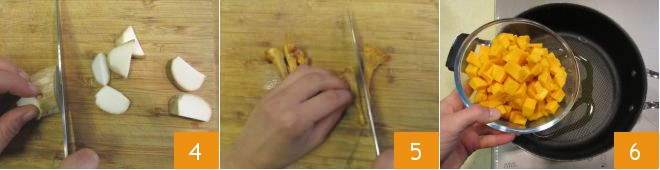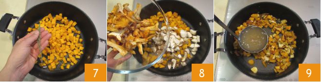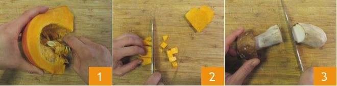 E então, depois de esfregá-los com um pano para remover as impurezas, corte-os em pedaços 4. Limpe da mesma forma os chanterelles e depois divida-os ao meio no sentido do comprimento 5. Em uma panela, aqueça um fio de azeite de oliva, em seguida adicione a abóbora 6.