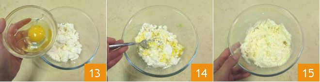 Em uma tigela, coloque a ricota bem escorrida e o ovo 13. Misture com um garfo 14 para obter um creme homogêneo 15.