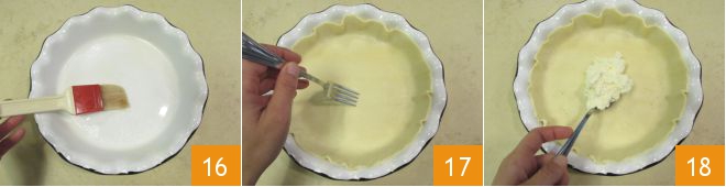 Unte uma forma de 18 cm de diâmetro 16 e coloque dentro um disco de massa folhada, fure o fundo com os dentes de um garfo 17. Recheie com metade do creme de ricota 18.