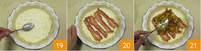 Nivele com as costas de uma colher 19, coloque metade das fatias de bacon crocante por cima 20 e cubra com metade dos vegetais salteados 21.