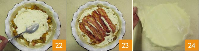 Agora faça uma segunda camada com o restante do creme 22, o bacon 23 e os vegetais, até acabar o recheio. Cubra a torta com outra camada de massa folhada 24, de modo que as duas massas se unam na borda.